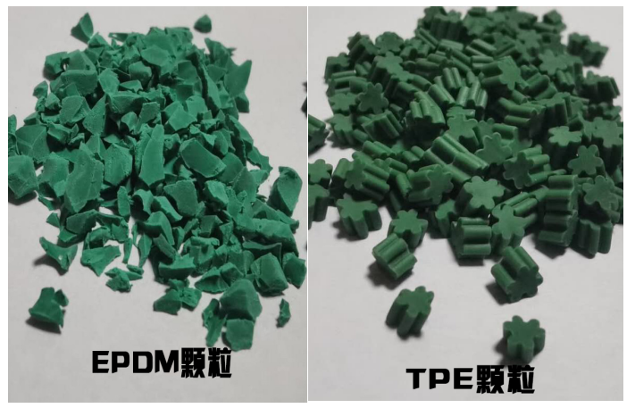 “EPDM顆?!敝饕煞质侨冶z,經(jīng)過高溫硫化制得,“TPE顆?!庇址Q熱塑性彈性體,可稱為人造橡膠。兩者從形狀上面有著較大差異,“EPDM顆?!背尸F(xiàn)出不規(guī)則形狀、不同大小的顆粒,而“TPE顆粒”的外形和尺寸都十分一致。